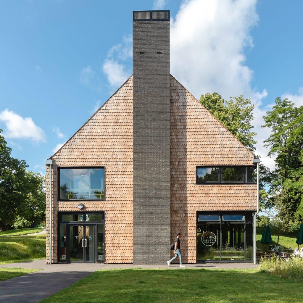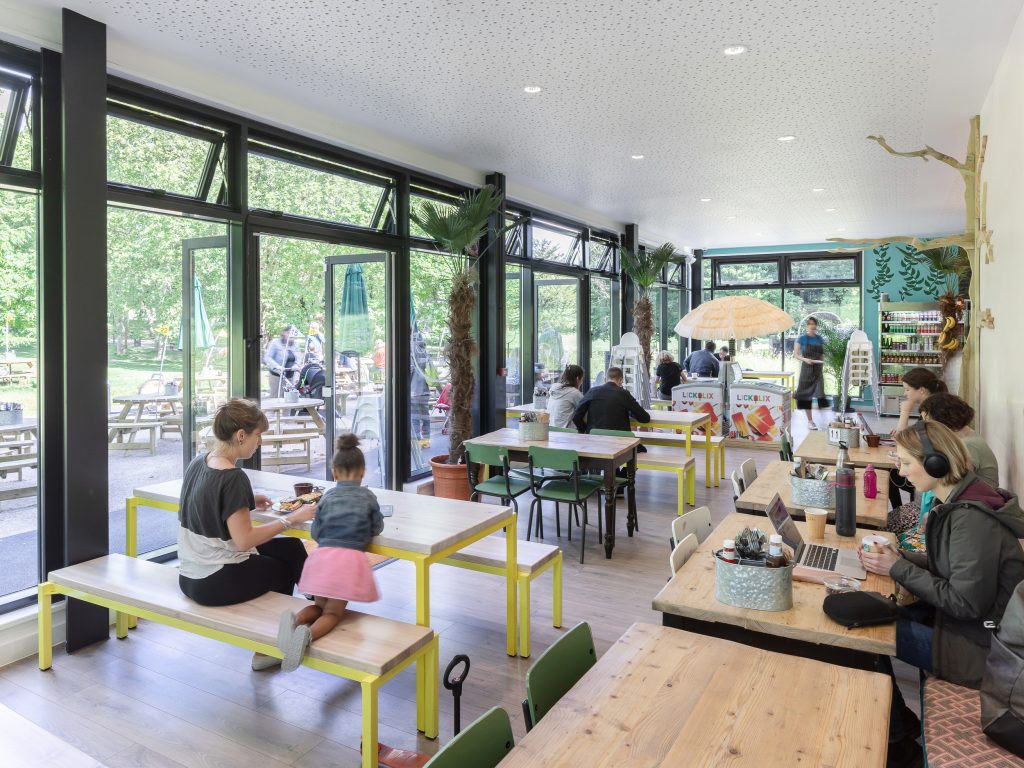 These were chosen to respond to the scaled skin of the dinosaur models, creating a connection between the cafe building and the models at the other end of the lake. Carefully chosen areas of glazing maximise views over the park from within the cafe at ground level and over the lake from within the events space at first floor. The new cafe business will support the ongoing conservation of the unique grade I listed dinosaur sculptures and geological illustrations.