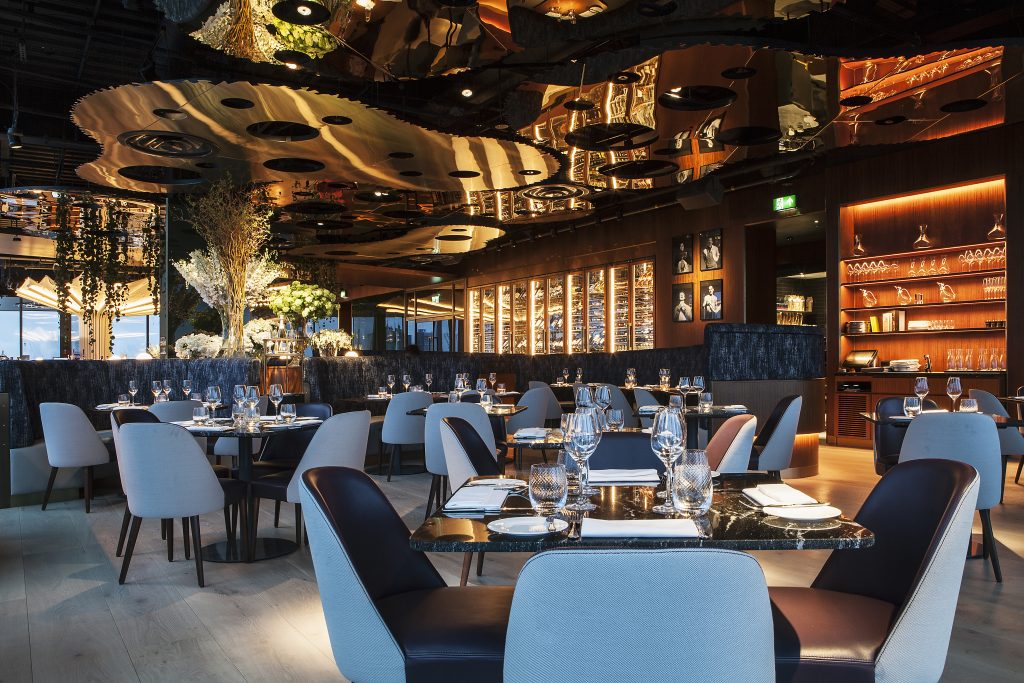 The restaurant offers a variety of distinct indoor settings including the main restaurant, a private dining room, a cocktail bar, and a more casual brasserie and grill. The bar serves as a centre-piece for 20 Stories, with the dramatic form of its shimmering, illuminated canopy referencing “a grand specimen tree”.